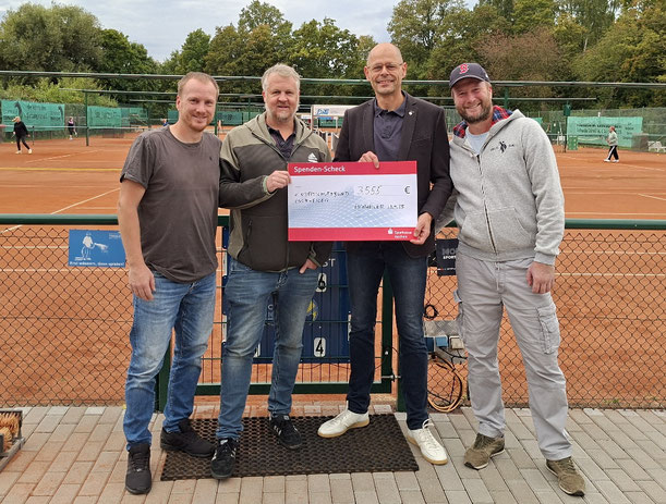 Unser Foto zeigt die Organisatoren Sven Baumann, Tobi Röber und Jens Baumann (von links) bei der Scheckübergabe an den Geschäftsführer des Kinderschutzbundes Thorsten Ingermann (2. von rechts).